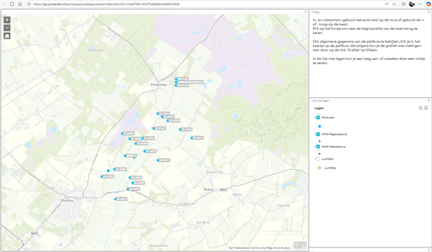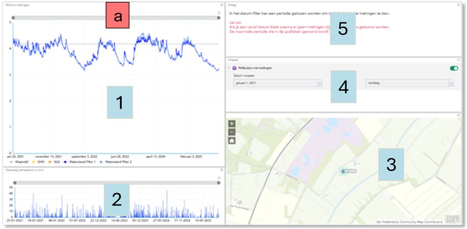 In venster 3 ziet u een kaart van het gebied. Hierin staat het label van de gekozen peilbuis waarvan u de gegevens in scherm 1 en 2 ziet.