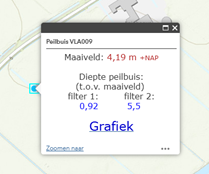In de kaart ziet u een aantal ‘labels’ met daarop een nummer, bijvoorbeeld ‘VLA009’. Dit zijn de locaties van de peilbuizen. Als u op zo'n label klikt, verschijnen er gegevens over deze peilbuis in een klein nieuw venster. Hieronder ziet u hiervan een voorbeeld. Bovenaan in dit kleine venster ziet u de hoogte van deze plek zien (maaiveld). Deze wordt altijd weergegeven in meters ten opzichte van het Nieuw Amsterdams Peil (N.A.P.). In onderstaand voorbeeld is dat 4,19 meter boven N.A.P. Daaronder ziet u gegevens over de diepte van de peilbuis. In iedere peilbuis zit een filter. Deze filters zijn de feitelijke meetpunten: in het midden van de filter zit een meetsensor. De sensor meet het waterpeil op deze plek.