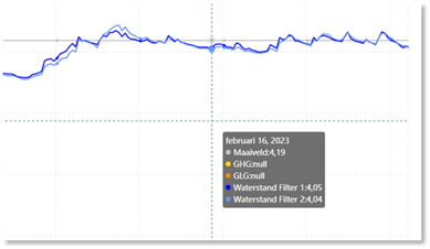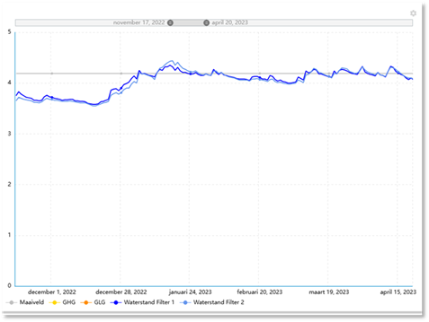 Hier staan de meetgegevens uit de twee peilbuizen VLA009. Van links naar rechts vindt u alle meetgegevens vanaf de start (januari 2021) tot aan de laatste keer dat de peilbuis is uitgelezen. Meetdata van alle peilbuizen wordt elk kwartaal uitgelezen en aan deze viewer toegevoegd. Met de schuifbalk bovenaan (a) kunt u de periode waarover u gegevens ziet, verkorten. Hiervoor houdt u uw muis op één van de bolletjes aan weerszijden en schuift deze naar de gewenste datum. Hieronder vindt u een voorbeeld van hoe dat eruitziet.