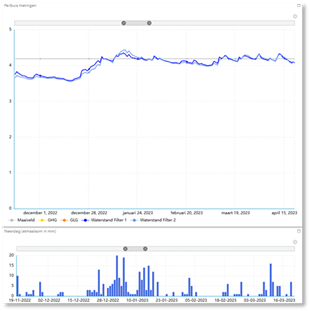 In venster 2 ziet u de neerslag in millimeters per etmaal van de volledige periode dat de peilbuizen actief zijn. Zo kunt u de hoeveelheid neerslag die gedurende een bepaalde periode is gevallen vergelijken met de grondwaterstanden over diezelfde periode. Hieronder ziet u een uitsnede van venster 1 en 2, waarbij de relatie tussen neerslag en grondwaterstand goed is te zien.