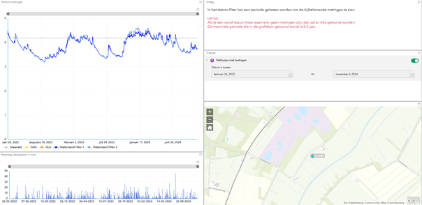 In dit venster kunt u een datum invullen om gegevens van de gekozen peilbuis te raadplegen. U kunt een specifieke dag kiezen, maar ook een periode van bijvoorbeeld twee weken. Eigenlijk doet dit hetzelfde als de schuifbalken boven venster 1 en 2, maar als u in venster 4 een specifieke datum opgeeft, ziet u in zowel venster 1 als venster 2 de gegevens van de gevraagde periode. Zo kunt u peilbuismetingen en neerslag exact over elkaar heen leggen, zoals hieronder weergegeven. Hier ziet u de data van peilbuis VLA009 tussen 26 februari 2022 en 4 november 2024: